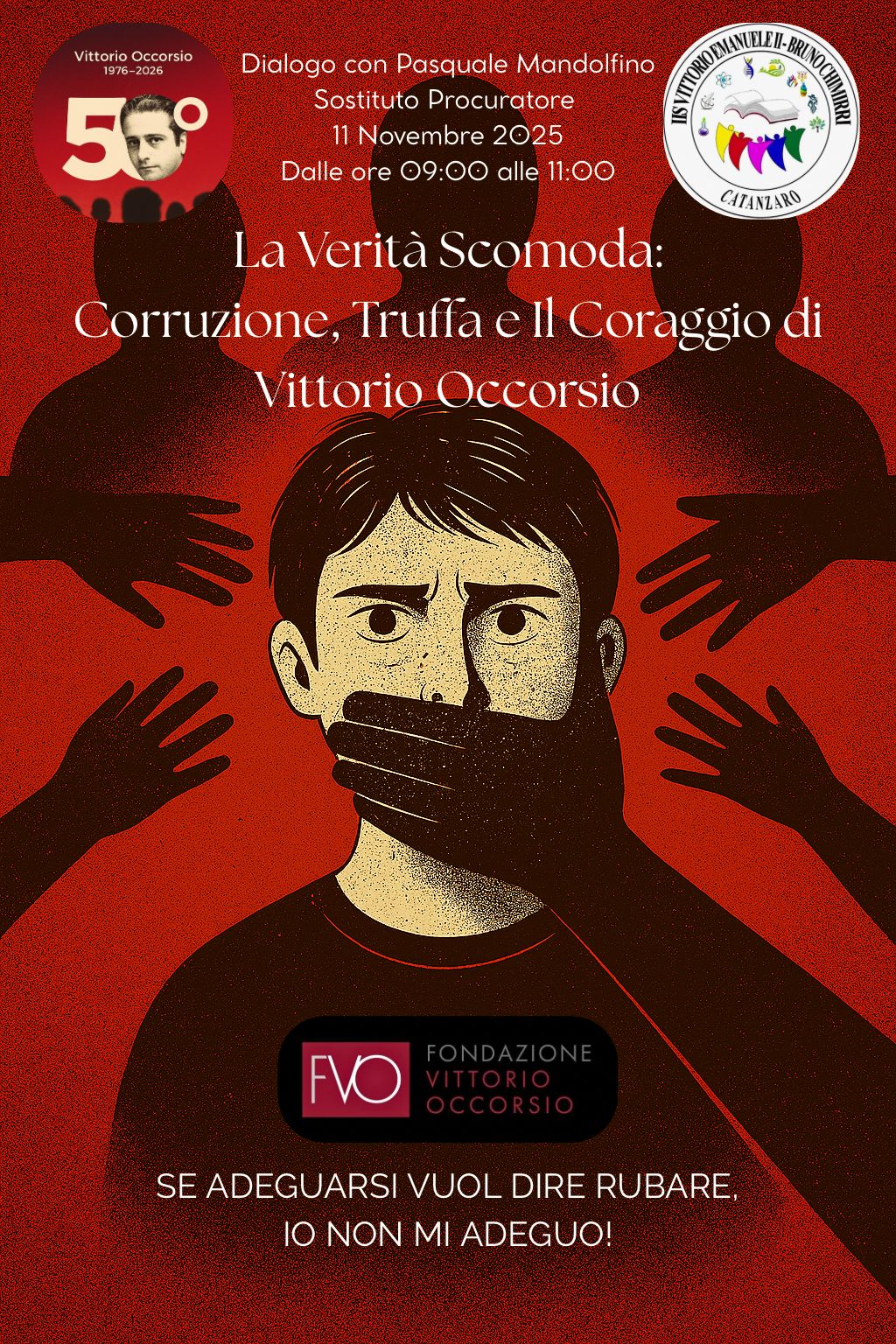 L’appuntamento, dal titolo “La verità scomoda: corruzione, truffa e il coraggio di Vittorio Occorsio”, in programma dalle ore 9:00 alle 11:00, prevede l’intervento del Sostituto Procuratore presso la Direzione Distrettuale Antimafia di Catanzaro, Pasquale Mandolfino che dialoga con studenti e studentesse dell’Istituto sul tema della legalità, approfondendo i fenomeni della corruzione e della truffa, e riflettendo sul coraggio e l’impegno di Vittorio Occorsio nella difesa della verità e della giustizia.