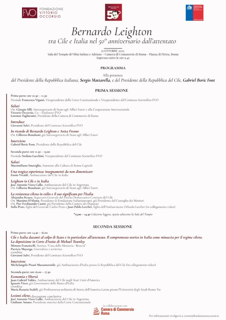 Il 15 ottobre 2025 presso la Sala del Tempio di Vibia Sabina e Adriano, sede della Camera di Commercio di Roma, la Fondazione Vittorio Occorsio insieme all’Ambasciata del Cile in Italia organizza il seminario “Bernardo Leighton – tra Cile e Italia nel 50° anniversario dall’attentato”.