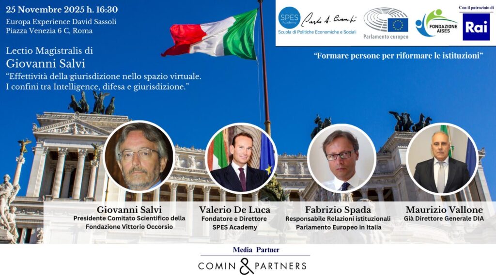 Il 25 novembre 2025, presso l’Europa Experience – Davide Sassoli di Roma, il Presidente del Comitato Scientifico della Fondazione Vittorio Occorsio tiene una Lectio Magistralis sul tema “Effettività della giurisdizione nello spazio virtuale. I confini tra intelligence, difesa e giurisdizione“, nell’ambito dell’iniziativa organizzata dalla Scuola di Politiche Economiche e Sociali Carlo Azeglio Ciampi.