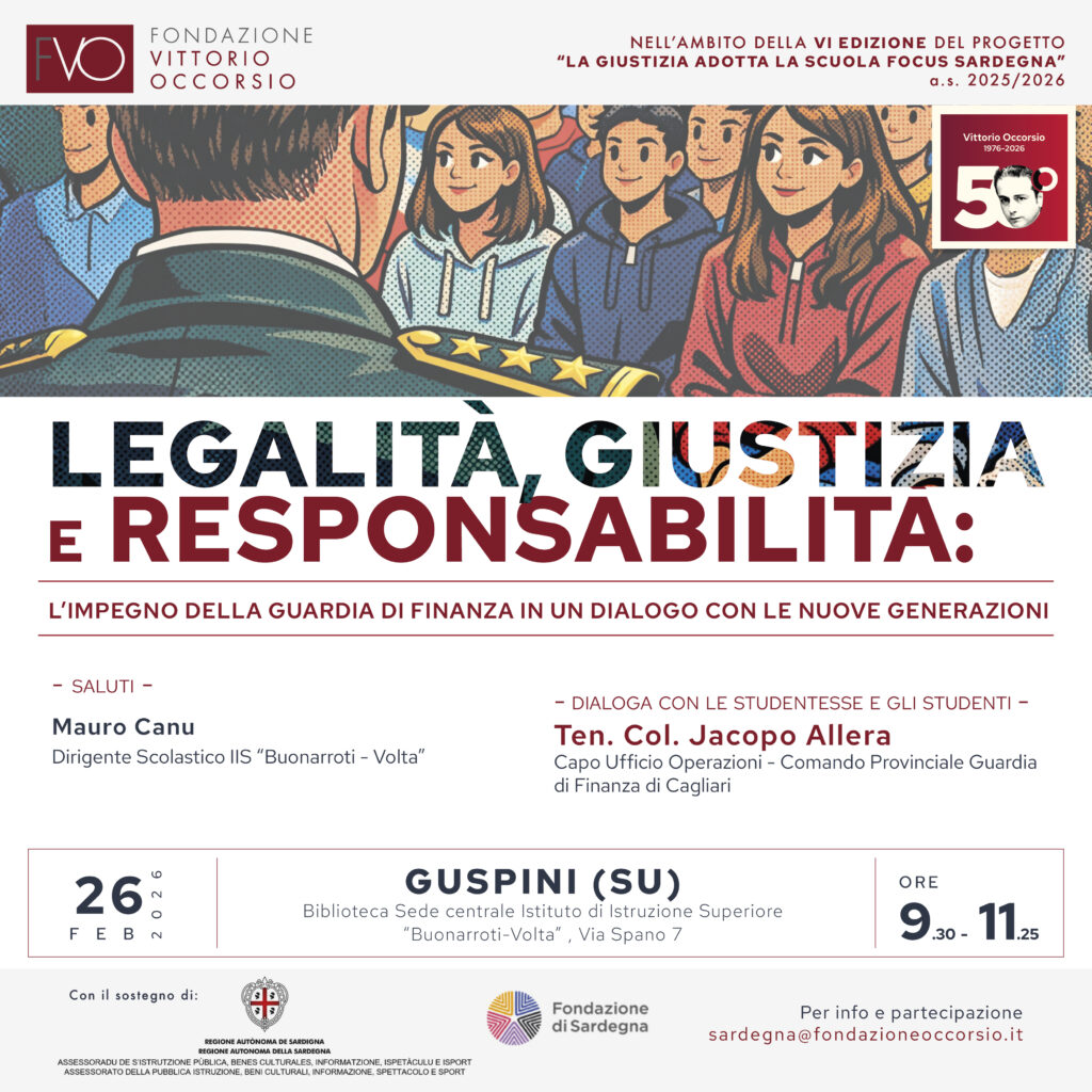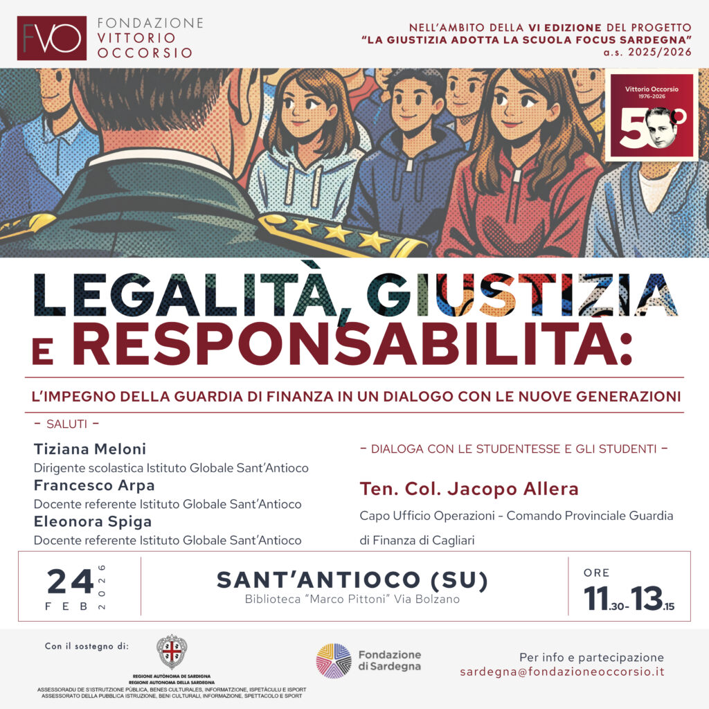L’evento, organizzato dalla Fondazione Vittorio Occorsio, con il sostegno della Regione Autonoma della Sardegna e della Fondazione di Sardegna, si inserisce nell’ambito della VI edizione del progetto “La Giustizia adotta la Scuola – Focus Sardegna”.